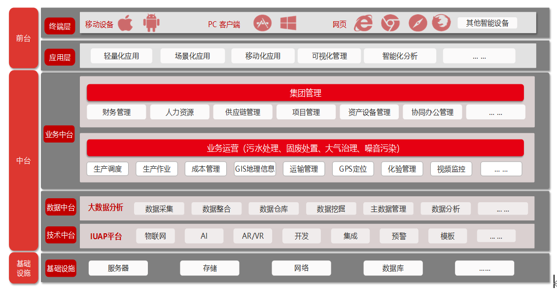 對于環(huán)保企業(yè)來說,需要通過一體化信息化平臺(tái)建設(shè)實(shí)現(xiàn)企業(yè)數(shù)字化轉(zhuǎn)型,建設(shè)集團(tuán)管控、業(yè)務(wù)運(yùn)營、大數(shù)據(jù)分析以及應(yīng)用集成等四個(gè)方面,具體如下:
