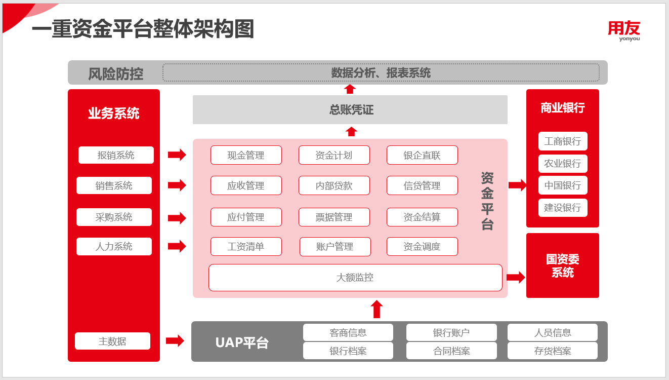 攜手用友打造資金平臺(tái),搭建資金集中監(jiān)控系統(tǒng),實(shí)行資金預(yù)算計(jì)劃管理,成立資金結(jié)算中心,將資金資源進(jìn)行集中管控,提升資金使用的安全性、收益性和效率性;打通與采購(gòu)、銷售、報(bào)銷、人力系統(tǒng)的對(duì)接,實(shí)現(xiàn)數(shù)據(jù)不落地處理;應(yīng)用銀企直聯(lián),實(shí)現(xiàn)線上交易結(jié)算;應(yīng)用票據(jù)管理模塊,實(shí)現(xiàn)票據(jù)臺(tái)賬數(shù)字化;實(shí)現(xiàn)與國(guó)資委大額監(jiān)控系統(tǒng)的對(duì)接上報(bào);實(shí)現(xiàn)綜合資金數(shù)據(jù)提取和分析,為資金決策提供支撐。
