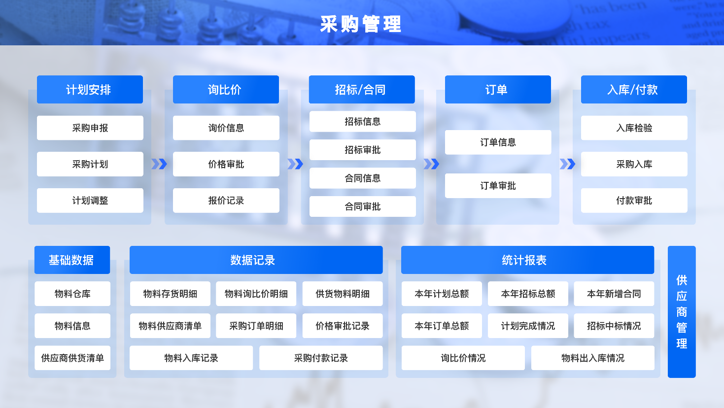 以單位、企業(yè)生產(chǎn)經(jīng)營(yíng)的采購(gòu)需求為原點(diǎn),管理供應(yīng)商與采購(gòu)的相關(guān)信息。按照采購(gòu)、執(zhí)行、監(jiān)管分立的原則,依靠科學(xué)化、合理化的采購(gòu)制度和監(jiān)管制度,有效避免采購(gòu)過程中的暗箱操作。通過信息化手段規(guī)范采購(gòu)流程,完善合法、合規(guī)的招標(biāo)與合同業(yè)務(wù)流程,加強(qiáng)審批流程控制和數(shù)據(jù)統(tǒng)計(jì)分析,強(qiáng)化對(duì)采購(gòu)業(yè)務(wù)的管控與監(jiān)督。