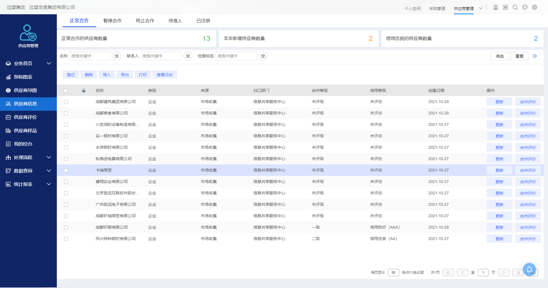 將供應(yīng)商的信息檔案作為供應(yīng)商管理的核心,從供應(yīng)商注冊(cè)、考察評(píng)價(jià)、準(zhǔn)入審批、樣品管理到合作評(píng)價(jià)、等級(jí)評(píng)定、信用平臺(tái)、問題整改直至供應(yīng)商的退出或停止合作,全過程均納入管理,從而提升單位、企業(yè)對(duì)供應(yīng)商信息的全方面掌握,強(qiáng)化對(duì)供應(yīng)商的管控。