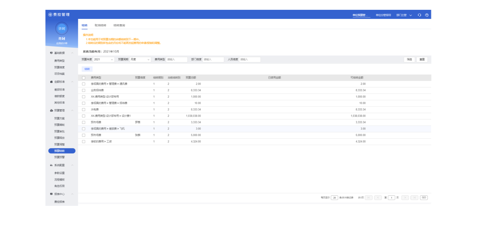 產(chǎn)品支持在會計期間與既定科目間進(jìn)行預(yù)算調(diào)整,如同部門不同科目間,同科目不同部門間,同部門不同月底間、同月度不同部門間等3.預(yù)算結(jié)轉(zhuǎn)