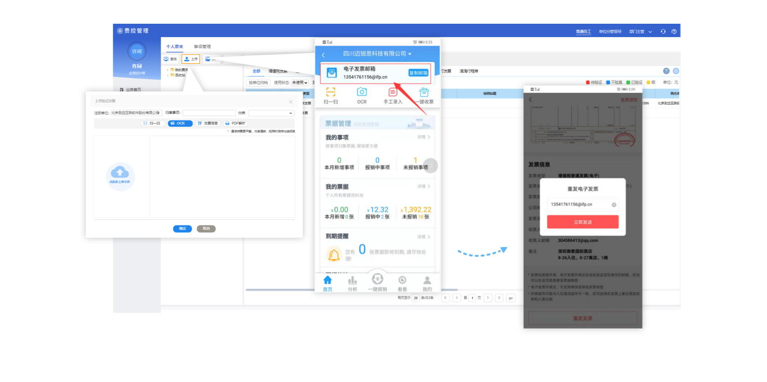 無感收票一鍵取票;OCR解析;發(fā)票查重驗真;發(fā)票內(nèi)控策略。