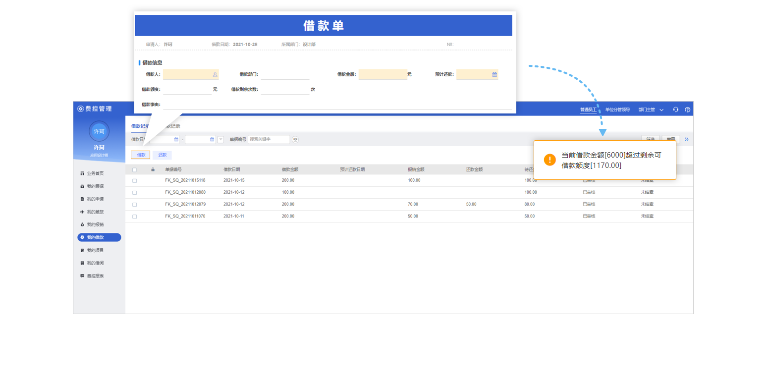 支持個人、部門借款額度配置支持欠款額度、欠款筆數(shù)控制;支持借款控制強度設(shè)置。